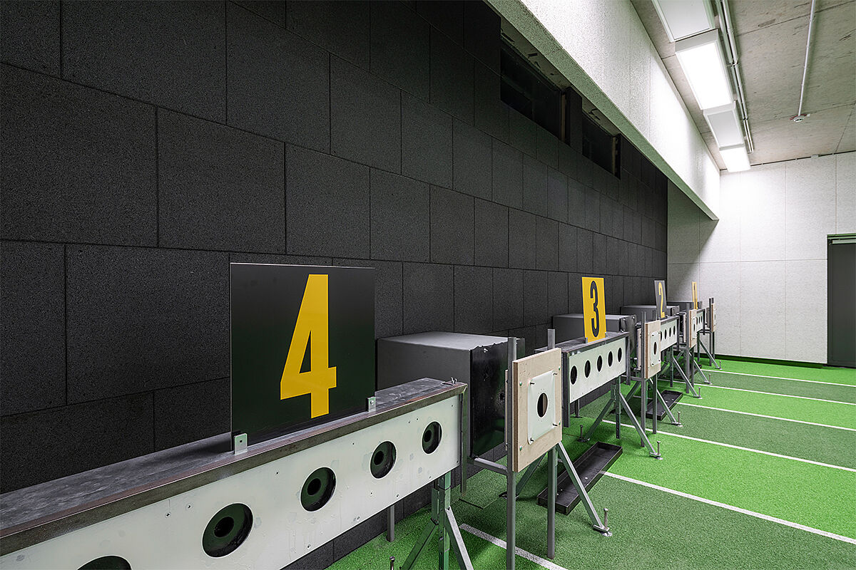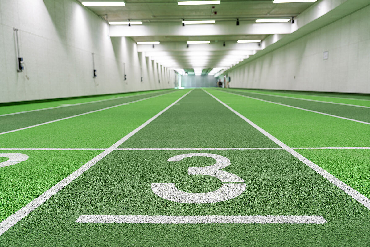 Eine Besonderheit ist die weltweit erste beschusssichere Laufbahn, die mit nachhaltig zertifizierten